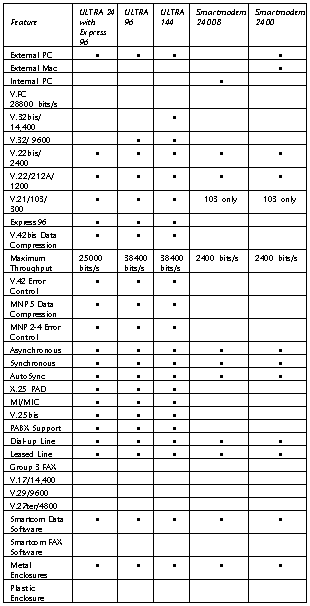 The following chart summarizes the features available in the Hayes ULTRA product lines.