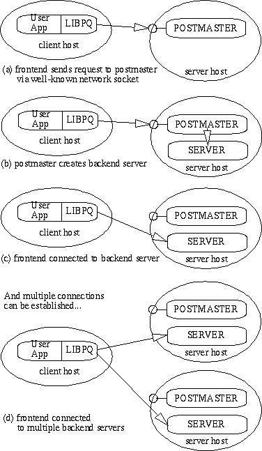 A single postmaster manages a given collection of databases on a single host. Such a collection of databases is called an installation or site. Frontend applications that wish to access a given database within an installation make calls to the library. The library sends user requests over the network to the postmaster (How a connection is established(a)), which in turn starts a new backend server process (How a connection is established(b))